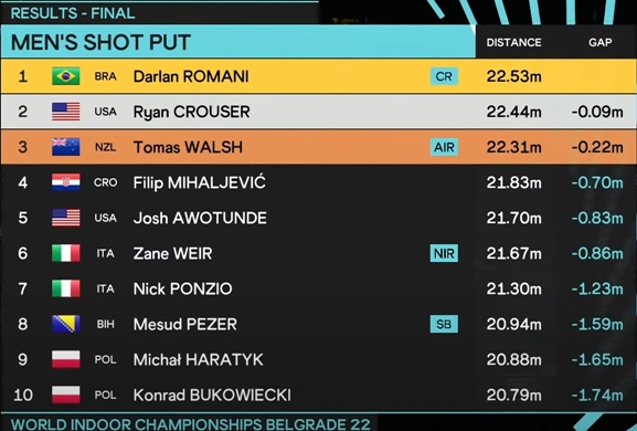 ウォルシュも中々記録を伸ばせず、六投目に22m31を投げて記録を伸ばすも銅メダルは変わらず、クルーザーは一投目の22m44がベストで銀メダル。