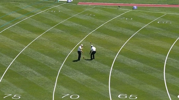 日本選手権などの大きな大会では正確性を期すため機械計測が行われる。投擲物の落下痕に審判が棒を突き刺し、機械で投擲地点からの距離を測定する方式を用いる(光波測定)。