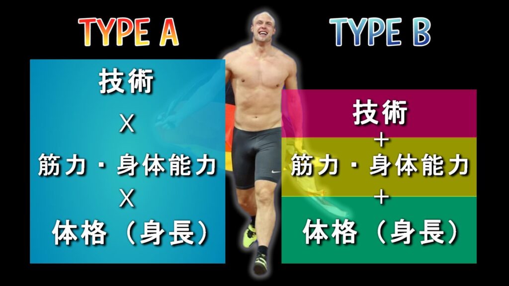 持っている力をそのまま投擲物に伝えるのがB(=フィジカルに大きく依存)だとすれば、選手自身の運動能力や身体操作によりプラスαの力を加えるのがA(=全ての要素を駆使・発揮し大きな力を生む)ではないかと私は考えている。
