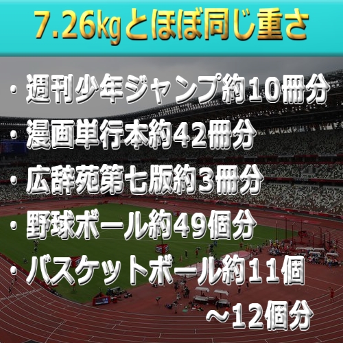 ・砲丸は厳密には7.257kg以上とされており、7.26kgは概数表記