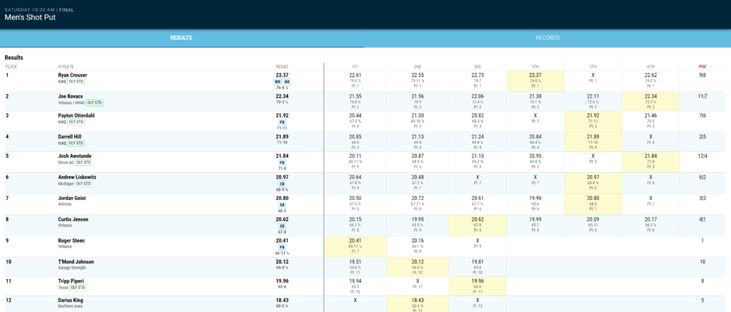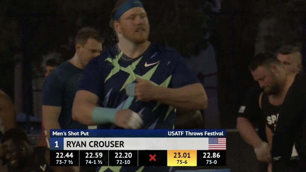 円盤投げにも出場したが8位(59m21)だった8https://texassports.com/sports/track-and-field/roster/ryan-crouser/6070。