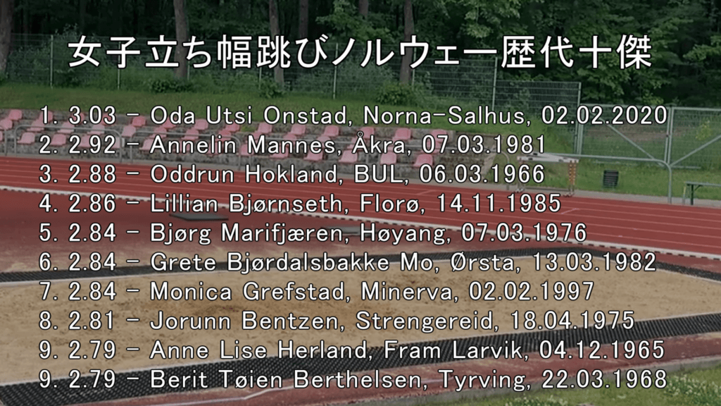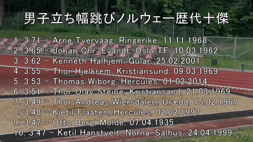 ちなみにTvervaag氏は立ち高跳びでも1m52を跳び、走幅跳6m78、三段跳でも14m50の記録を持っている。