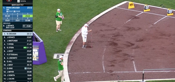 しかしそこは世界記録保持者の意地。クルーザーの三投目は世界記録ラインの手前に落下。23m12をマークしてコバクスを逆転。コバクスも三投目に22m62を投げ状態の良さをうかがわせたが、その後は記録を伸ばせず2位で競技終了。クルーザーは23m台を三回マークし、最終試技は22m98で終えた。